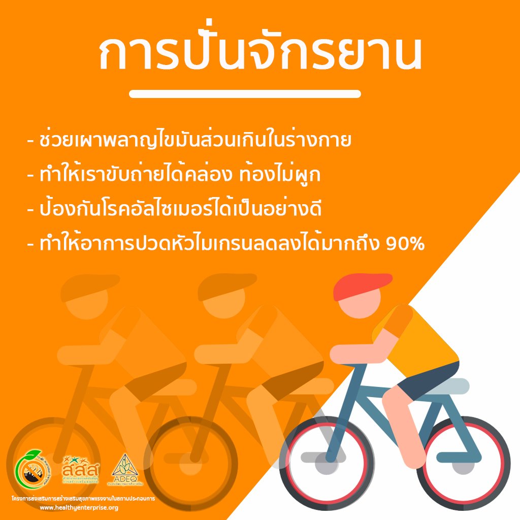 ช่วยในเรื่องของการเผาผลาญไขมันส่วนเกินในร่างกาย อีกทั้งช่วยกระตุ้นให้การไหลผ่านของอาหารไหลในลำไส้ทำได้เร็วขึ้น จะมีผลให้มีการดูดซับน้ำในลำไส้ใหญ่น้อยลง ก้อนอุจจาระก็จะมีความเปียกชื้น ไม่แข็งแห้ง ทำให้เราถ่ายได้คล่องขึ้น การปั่นจักรยานยังช่วยกระตุ้นการสร้างเซลล์สมองในส่วนที่เรียกว่า Hippocampus ซึ่งเป็นสมองส่วนที่ใช้ในด้านความจำ ซึ่งจะเริ่มเสื่อมอย่างรวดเร็วในผู้ที่มีอายุ 30 ขึ้นไป (พวกเรานี่เอง) การกระตุ้นการสร้างเซลล์สมองในส่วนดังกล่าวขึ้นมาทดแทนจึงสามารถที่จะช่วยป้องกันโรคอัลไซเมอร์ได้เป็นอย่างดี ปั่นจักรยานในระดับความเร็วปานกลาง เป็นเวลาประมาณ 30 นาที เป็นประจำ สามารถทำให้อาการปวดหัวไมเกรนลงไปได้มากจนถึง 90% ของกลุ่มตัวอย่างในงานวิจัยในสวีเดน เนื่องจากร่างกายมีการหลั่งสาร endorphins ซึ่งมีฤทธิ์ช่วยลดอาการปวดในร่างกายในปริมาณที่มากพอ