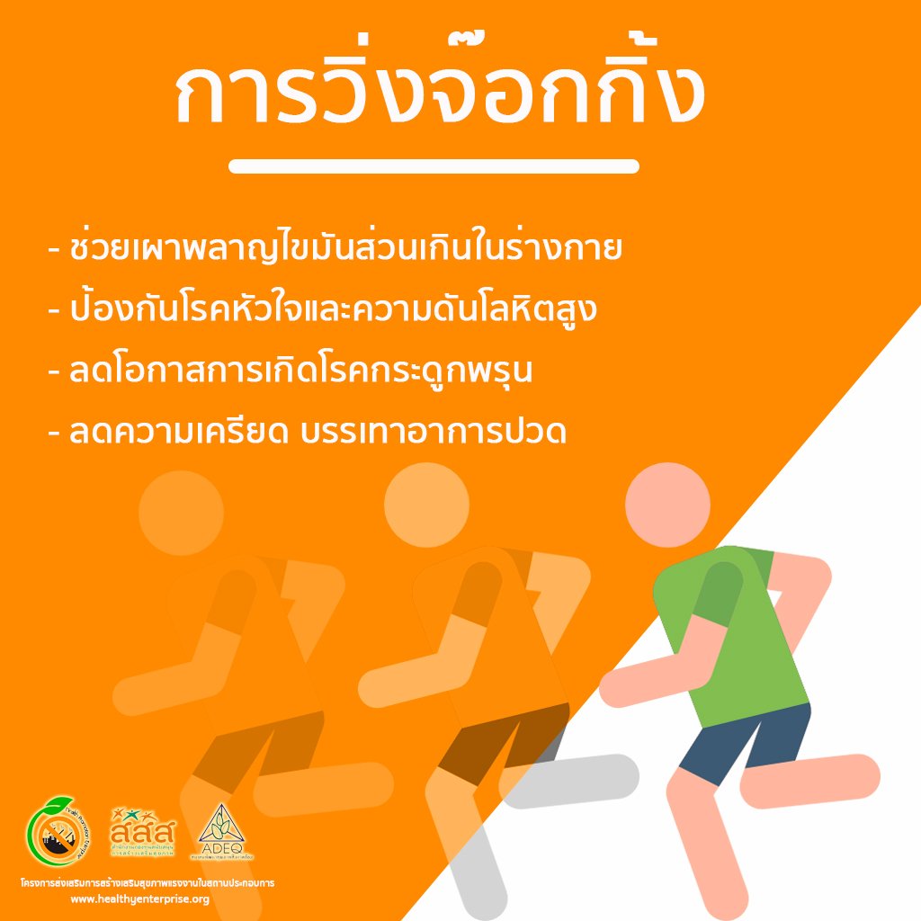 นอกจากจะช่วยเผาผลาญไขมันแล้ว การวิ่งจ๊อกกิ้งยังช่วยในเรื่องของการกระตุ้นระบบการไหลเวียนเลือด ช่วยส่งผลให้ปอดและหัวใจทำงานได้ดีขึ้น ป้องกันโรคต่าง ๆ ไม่ว่าจะเป็นโรคหัวใจ โรคความดันโลหิตสูง และยังลดระดับไขมันในเลือดได้ด้วย นอกจากนี้ยังช่วยเสริมสร้างมวลกระดูกให้แข็งแรง และช่วยลดโอกาสของการเกิดภาวะกระดูกพรุนได้ และแน่นอนช่วยลดความเครียดจากการทำงาน บรรเทาอาการปวด ในขณะที่วิ่งสมองจะหลั่งสารเอ็นดอร์ฟิน ซึ่งเป็นสารเคมีธรรมชาติที่มีฤทธิ์บรรเทาอาการปวด และทำให้ร่างกายรู้สึกสบาย ช่วยลดความตึงเครียดได้ด้วย