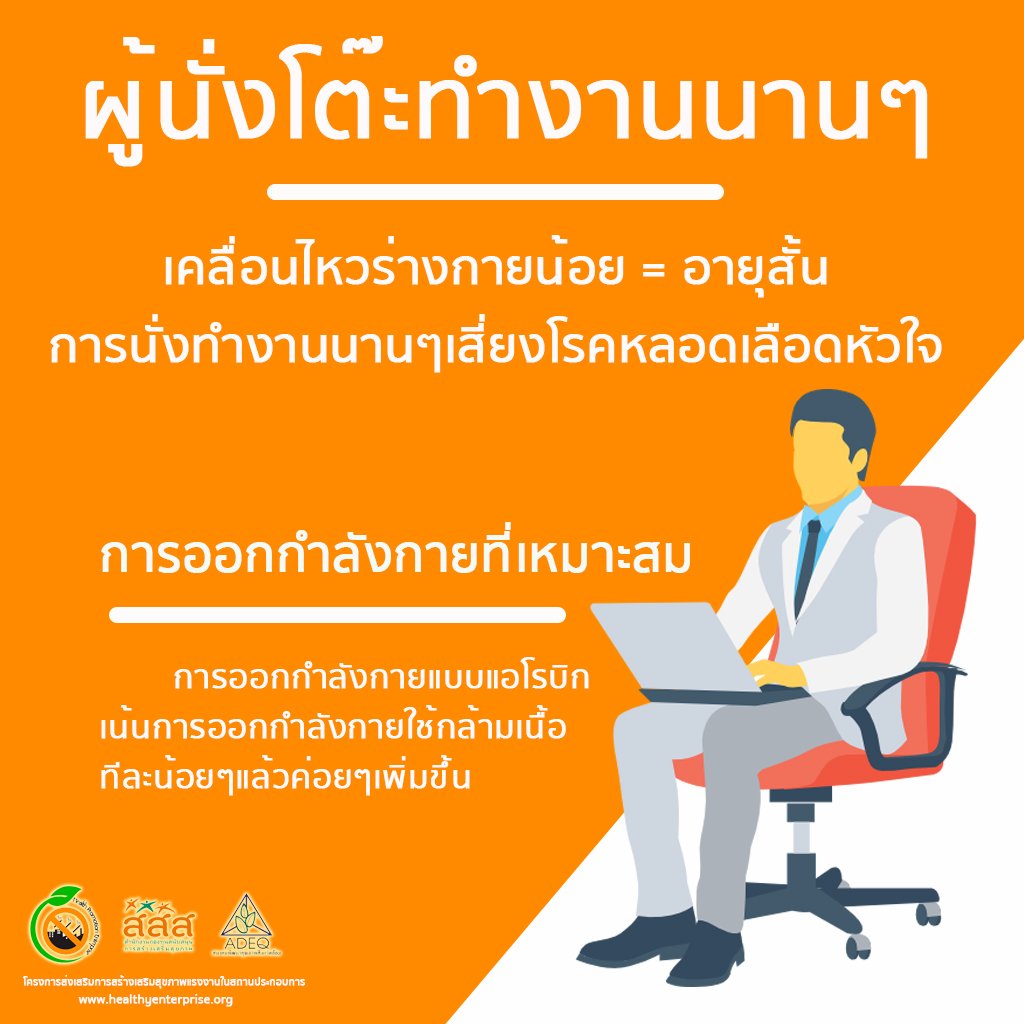 การนั่งโต๊ะทำงานหรือผู้ที่มีการเคลื่อนไหวร่างกายน้อยนั้น มีการศึกษาจำนวนมากพบว่ามีอายุสั้นและเกิดโรคต่าง ๆ ได้ง่ายกว่าคนที่มีการเคลื่อนไหวมากกว่า ประการแรกที่สำคัญที่สุดคือ ควรหาโอกาสเพิ่มการเคลื่อนไหวร่างกายในที่ทำงานให้มากที่สุดเท่าที่จะมีโอกาส เนื่องจากภาวะโรคหลอดเลือดหัวใจเป็นภาวะเสี่ยงในผู้นั่งโต๊ะทำงานดังนั้นจึงแนะนำให้เพิ่มการออกกำลังกายแบบแอโรบิคเพื่อเพิ่มสมรรถภาพร่างกายให้ดีขึ้นโดยให้เริ่มจากช้า ๆ น้อย ๆ และค่อย ๆ เพิ่มขึ้นที ละน้อย การออกกำลังกายเพื่อเพิ่มความแข็งแรงของกล้าม เนื้อเป็นสิ่งสำคัญในผู้ทำงานนั่งโต๊ะเนื่องจากลักษณะงานมีโอกาสที่จะไม่ได้ใช้กล้ามเนื้อมาก ทำให้กล้ามเนื้อ และเอ็นมีความแข็งแรงลดลง เน้นเพิ่มการเคลื่อนไหวและความแข็งแรงของกล้ามเนื้อเป็นหลัก