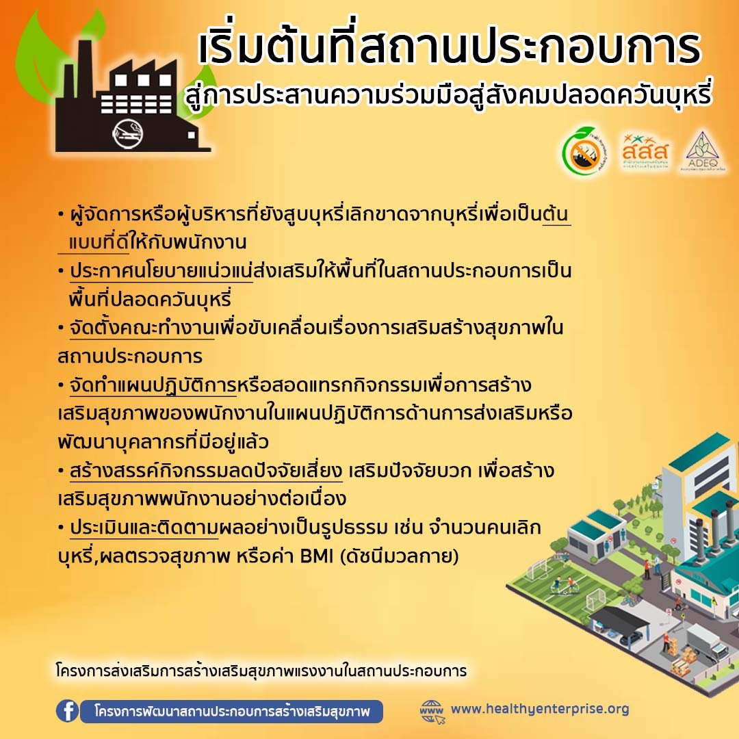 · ประกาศนโยบายแน่วแน่ส่งเสริมให้พื้นที่ในสถานประกอบการเป็นพื้นที่ปลอดควันบุหรี่ (ศึกษารายละเอียดเพื่อเป็นแนวทางปฏิบัติตามกฎหมาย)