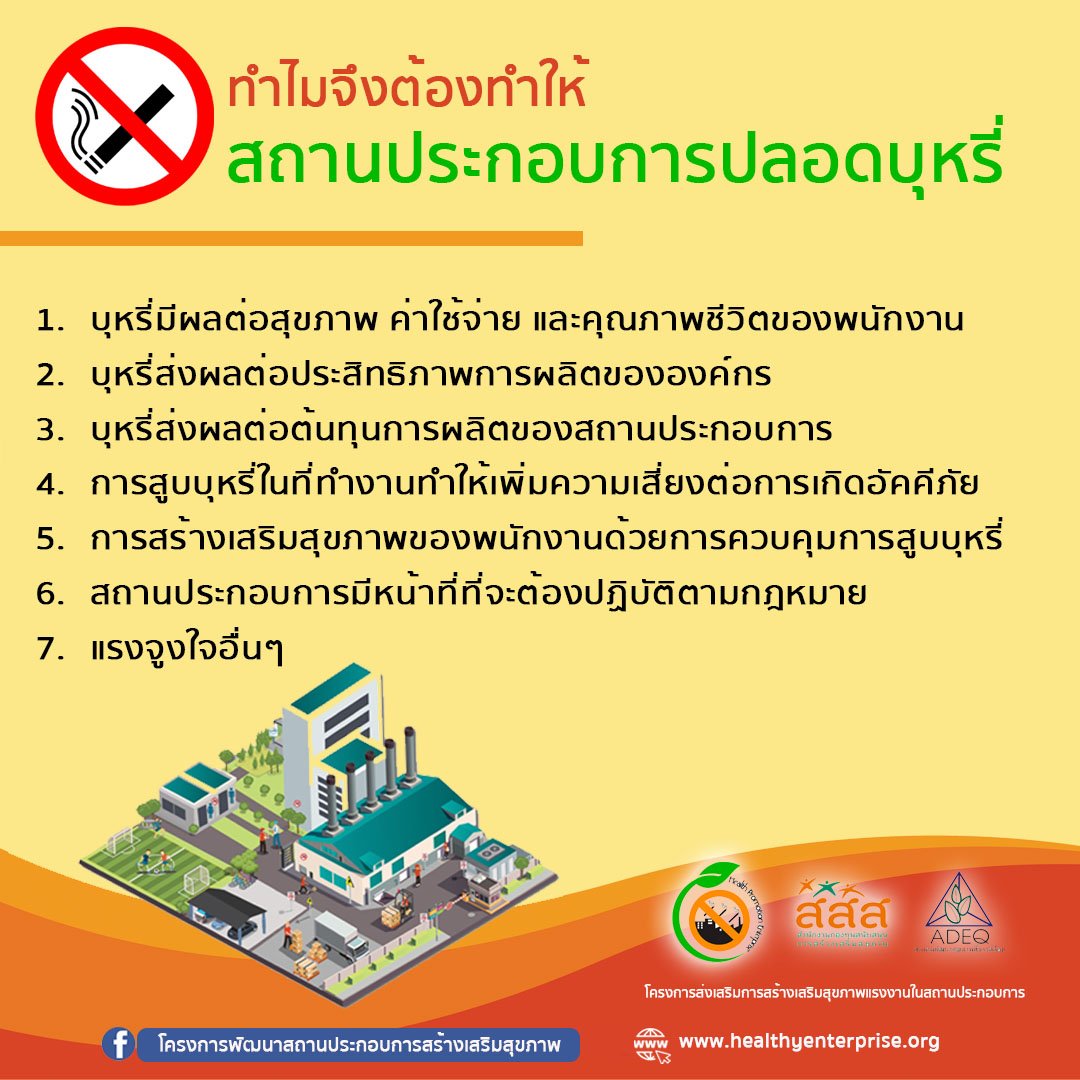 6. สถานประกอบการมีหน้าที่ที่จะต้องปฏิบัติตามกฎหมายแห่งราชอาณาจักรไทยเพื่อคุ้มครองสุขภาพผู้ไม่สูบบุหรี่จากการได้รับควันบุหรี่มือสองในสถานที่สาธารณะและที่ทำงานทั้งภาครัฐและเอกชยทั่วประเทศ