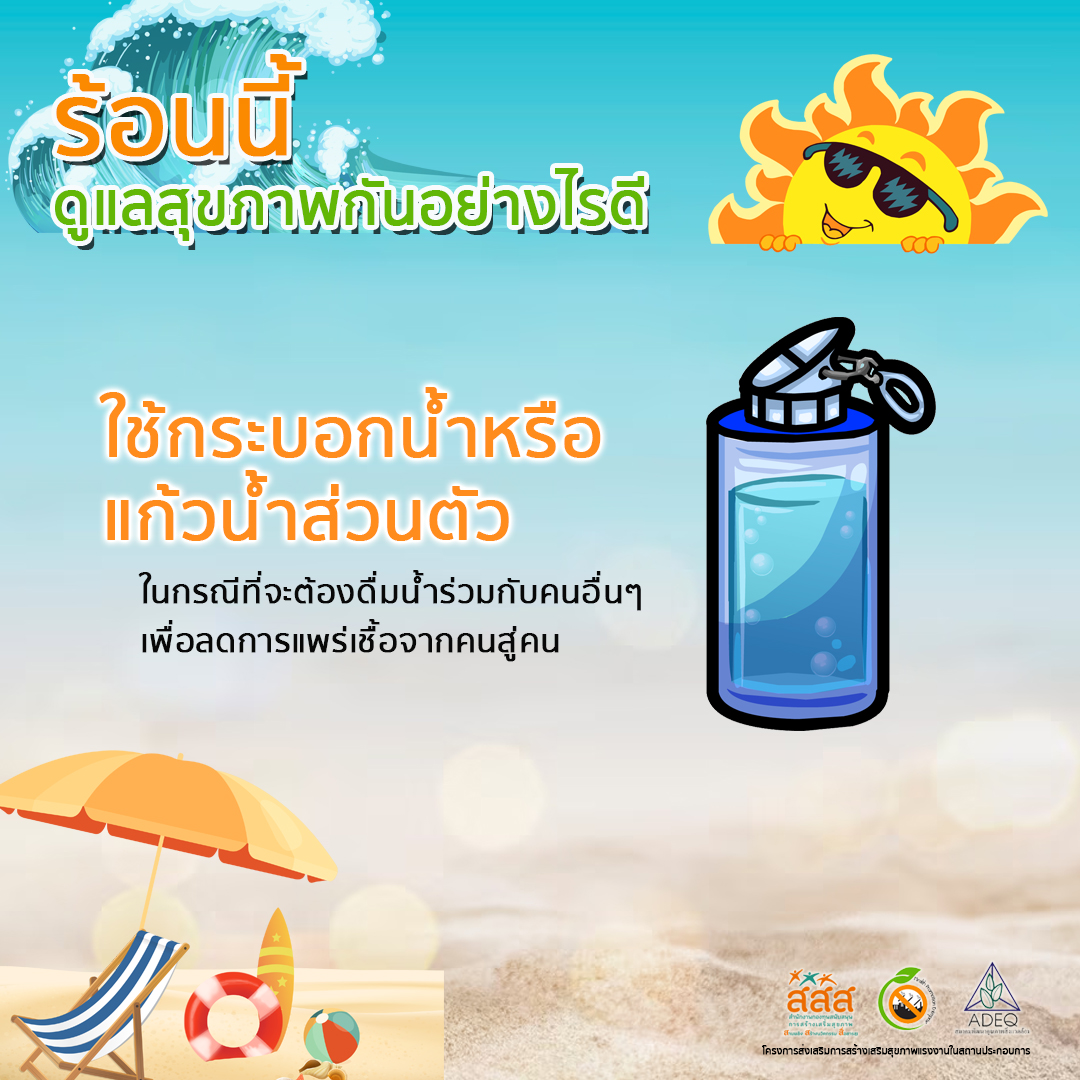 · ใช้กระบอกน้ำหรือแก้วน้ำส่วนตัวในกรณีที่จะต้องดื่มน้ำร่วมกับคนอื่นๆเพื่อลดการแพร่เชื้อจากคนสู่คน
