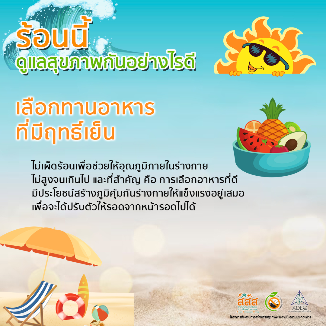 · เลือกทานอาหารที่มีฤทธิ์เย็นไม่เผ็ดร้อนเพื่อช่วยให้อุณภูมิภายในร่างกายไม่สูงจนเกินไป และที่สำคัญ คือ การเลือกอาหารที่ดีมีประโยชน์สร้างภูมิคุ้มกันร่างกายให้แข็งแรงอยู่เสมอเพื่อจะได้ปรับตัวให้รอดจากหน้ารอดไปได้