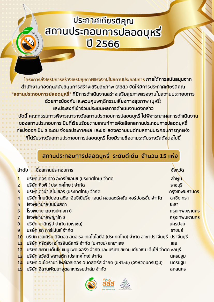 โครงการส่งเสริมการสร้างเสริมสุขภาพแรงงานในสถานประกอบการ ภายใต้การสนับสนุนจากสำนักงานกองทุนสนับสนุนการสร้างเสริมสุขภาพ (สสส.) จัดให้มีการประกาศเกียรติคุณ “สถานประกอบการปลอดบุหรี่” ที่มีการดำเนินงานสร้างเสริมสุขภาพแรงงานในสถานประกอบการ ด้วยการป้องกันและควบคุมพฤติกรรมเสี่ยงทางสุขภาพ (บุหรี่) และประสงค์เข้าร่วมประเมินผลการดำเนินงานดังกล่าว