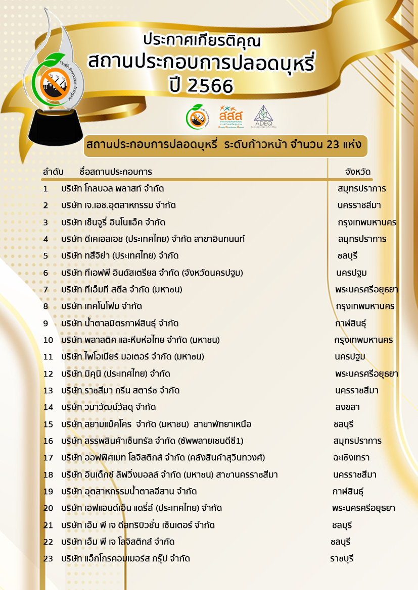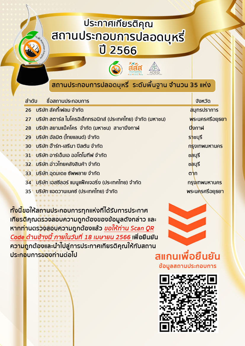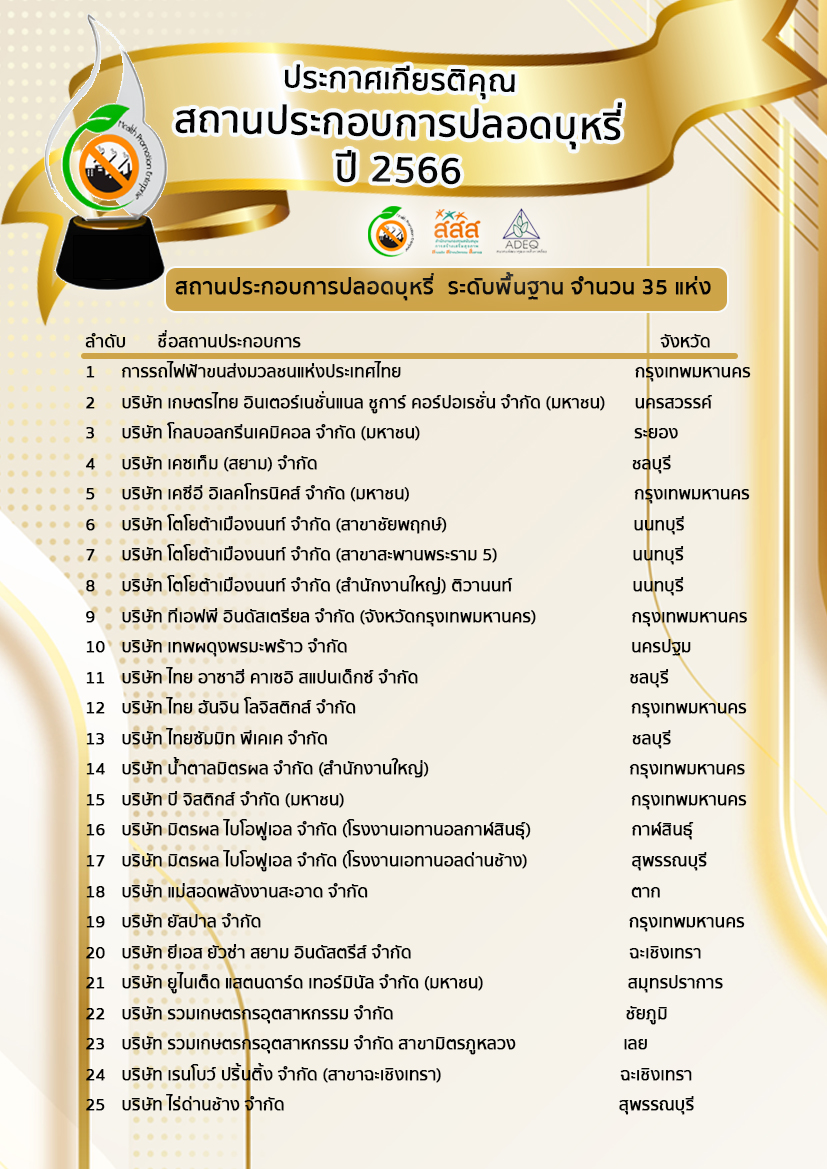 บัดนี้ คณะกรรมการพิจารณารางวัลสถานประกอบการปลอดบุหรี่ ได้พิจารณาผลการดำเนินงานของสถานประกอบการเป็นที่เรียบร้อยตามเกณฑ์การคัดเลือกสถานประกอบการปลอดบุหรี่ ที่แบ่งออกเป็น 3 ระดับ จึงขอประกาศผล และขอแสดงความยินดีกับสถานประกอบการทุกแห่งที่ได้รับรางวัลสถานประกอบการปลอดบุหรี่ โดยมีรายชื่อตามระดับรางวัลดังต่อไปนี้