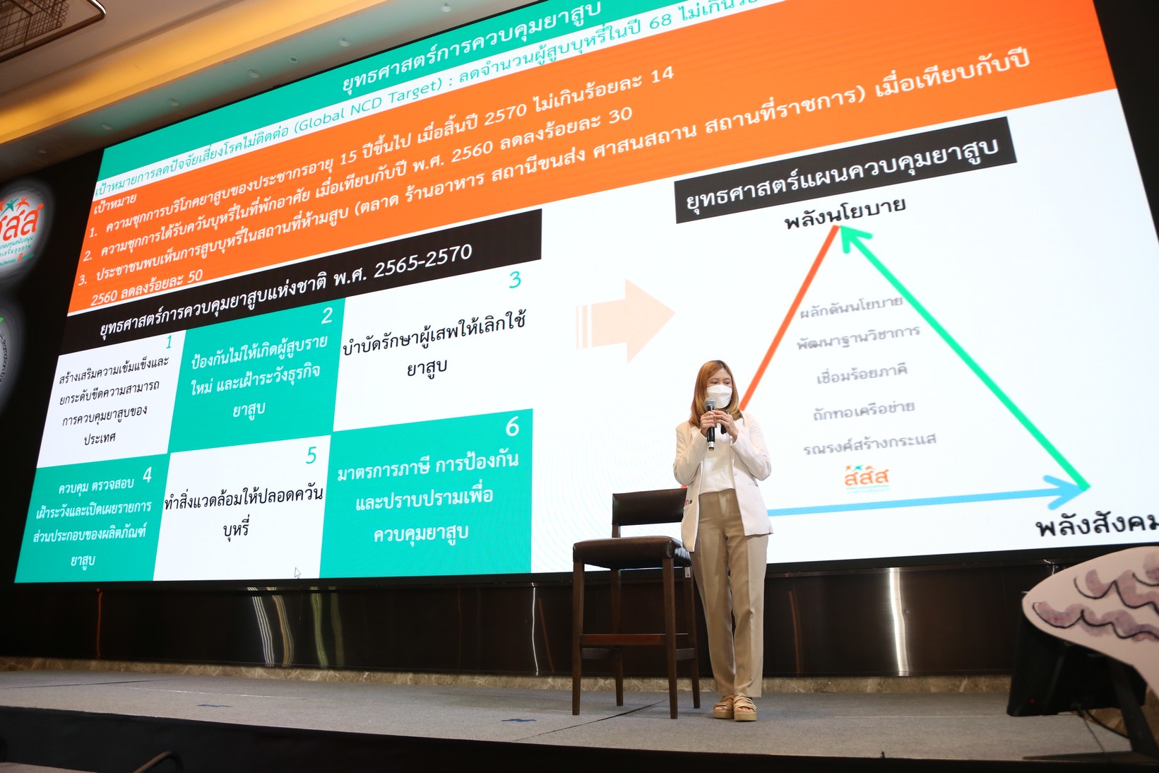 โดย น.ส.รุ่งอรุณ ลิ้มฬหะภัณ ผู้อำนวยการสำนักสนับสนุนการควบคุมปัจจัยเสี่ยงหลัก สสส. กล่าวว่า ผลสำรวจอัตราการสูบบุหรี่ของสำนักงานสถิติแห่งชาติล่าสุด ปี 2564 พบว่า ในภาพรวมอัตราการสูบบุหรี่ของประชากรอายุ 15 ปีขึ้นไปลดลงตามลำดับ แต่กลุ่มวัยทำงานสูบบุหรี่ถึง 21% ถือเป็นกลุ่มที่มีอัตราการสูบบุหรี่สูงกว่ากลุ่มอื่น จากรายงานขององค์การสหประชาชาติ ร่วมกับองค์การอนามัยโลก และกระทรวงสาธารณสุขไทย ปี 2564 พบว่า แต่ละปีมีผู้เสียชีวิตจากบุหรี่มากกว่า 80,000 คน คิดเป็น 18% ของการเสียชีวิตทั้งหมด ในจำนวนนี้เสียชีวิตจากควันบุหรี่มือสองกว่า 6,000 คน คิดเป็นความสูญเสียทางเศรษฐกิจเฉลี่ย 352,000 ล้านบาทต่อปี เทียบเท่า 2.1% ของผลิตภัณฑ์มวลรวมภายในประเทศ (GDP) องค์การสหประชาชาติ ให้คำแนะนำว่า การควบคุมยาสูบของไทยให้มีประสิทธิภาพ ต้องใช้เงินลงทุน 2,500 ล้านบาทต่อปี (น้อยกว่า 1% ของความสูญเสียทางเศรษฐกิจจากการสูบบุหรี่) ภายใน 15 ปี จะช่วยลดคนเสียชีวิตจากการสูบบุหรี่ 35,790 คน และลดคนป่วยด้วยโรคไม่ติดต่อ 169,117 คน หรือทุก 1 บาท ที่ลงทุนจะได้ผลตอบแทนกลับมาเป็นเงิน 2.53 บาท