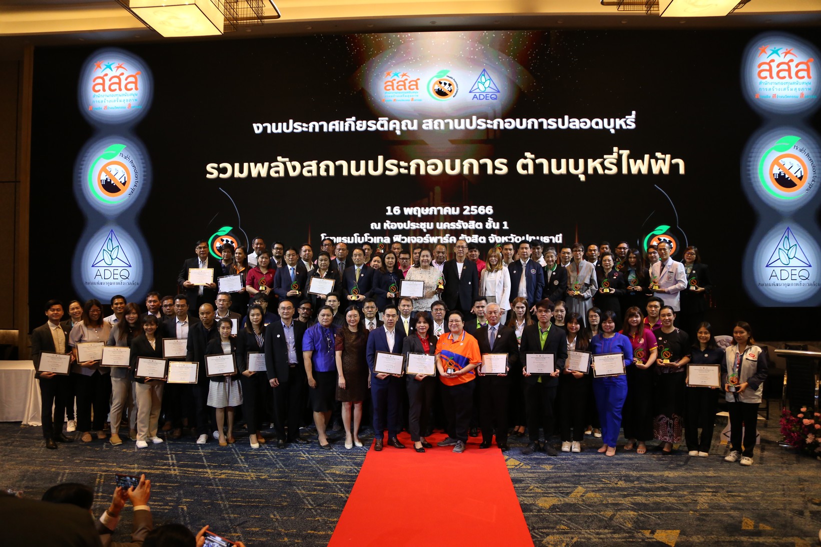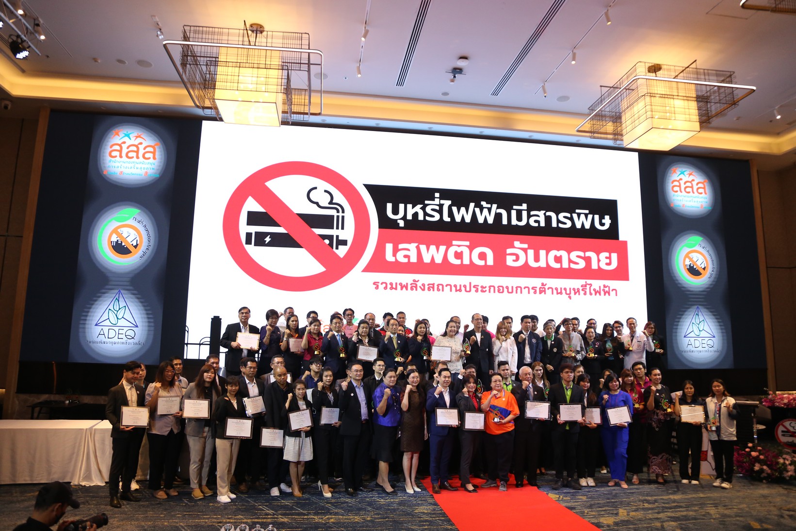 เมื่อเวลา 09.30 น. วันที่ 16 พ.ค. 2566 ที่โรงแรมโนโวเทล ฟิวเจอร์พาร์ค รังสิต จ.ปทุมธานี สมาคมพัฒนาคุณภาพสิ่งแวดล้อม ร่วมกับสำนักงานกองทุนสนับสนุนการสร้างเสริมสุขภาพ (สสส.) จัดงานประกาศเกียรติคุณสถานประกอบการปลอดบุหรี่ ภายใต้แนวคิด : รวมพลังสถานประกอบการ ต้านบุหรี่ไฟฟ้า ให้สถานประกอบการที่ผ่านเกณฑ์ประเมินสถานประกอบการปลอดบุหรี่ 73 แห่ง
