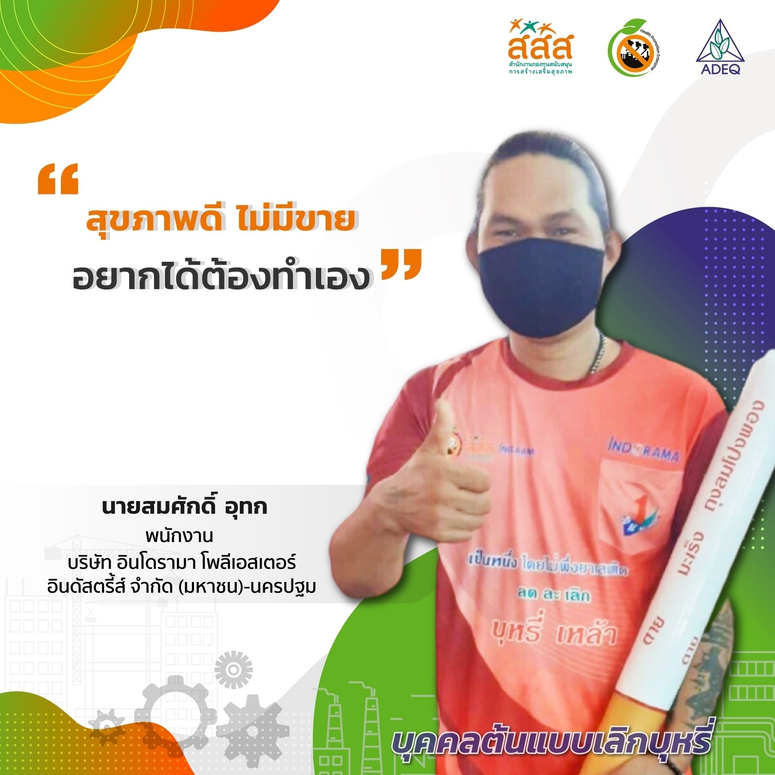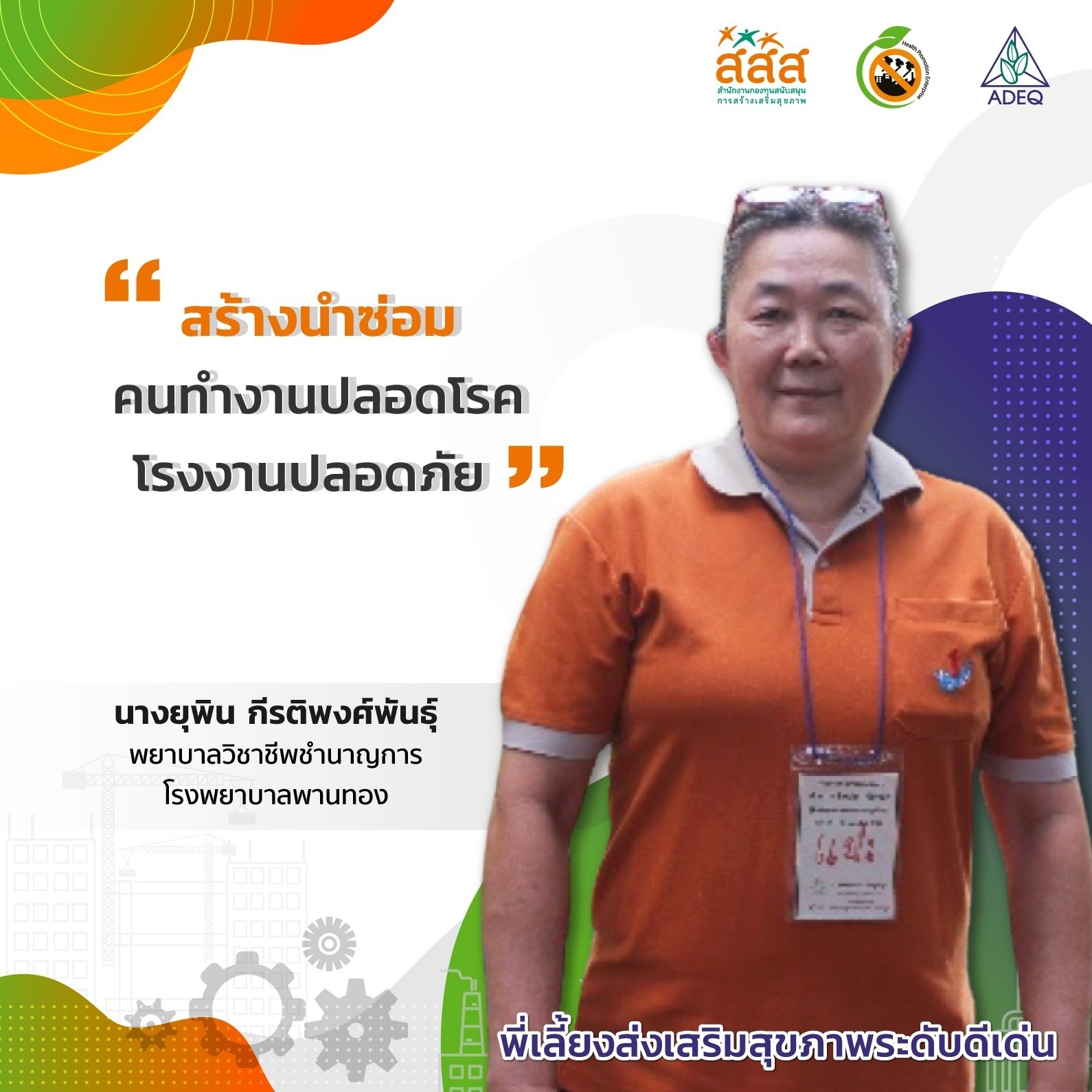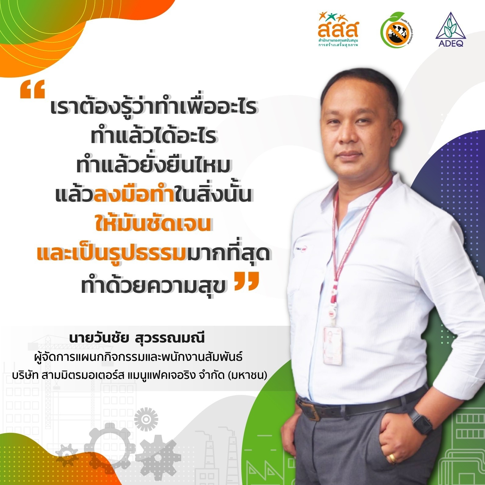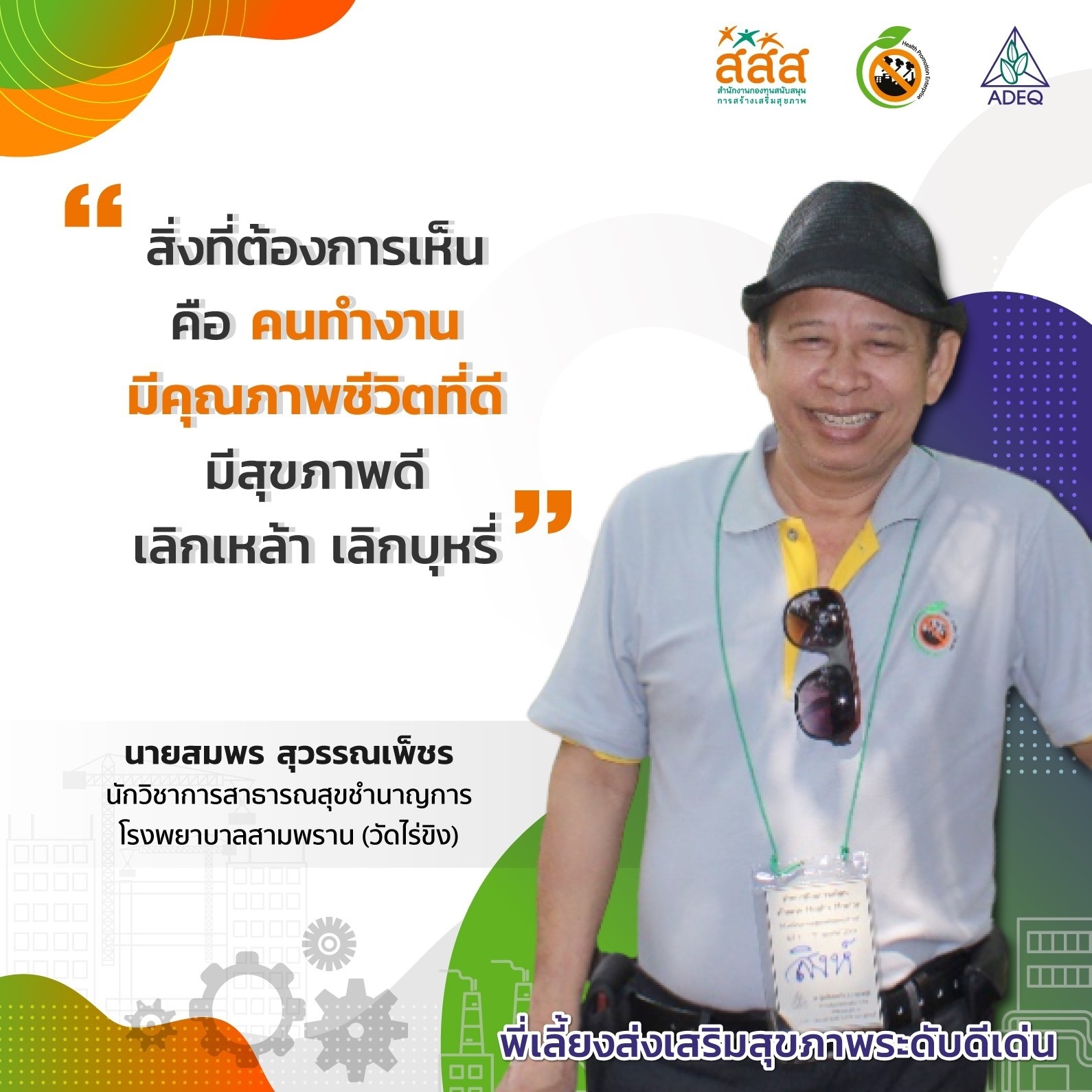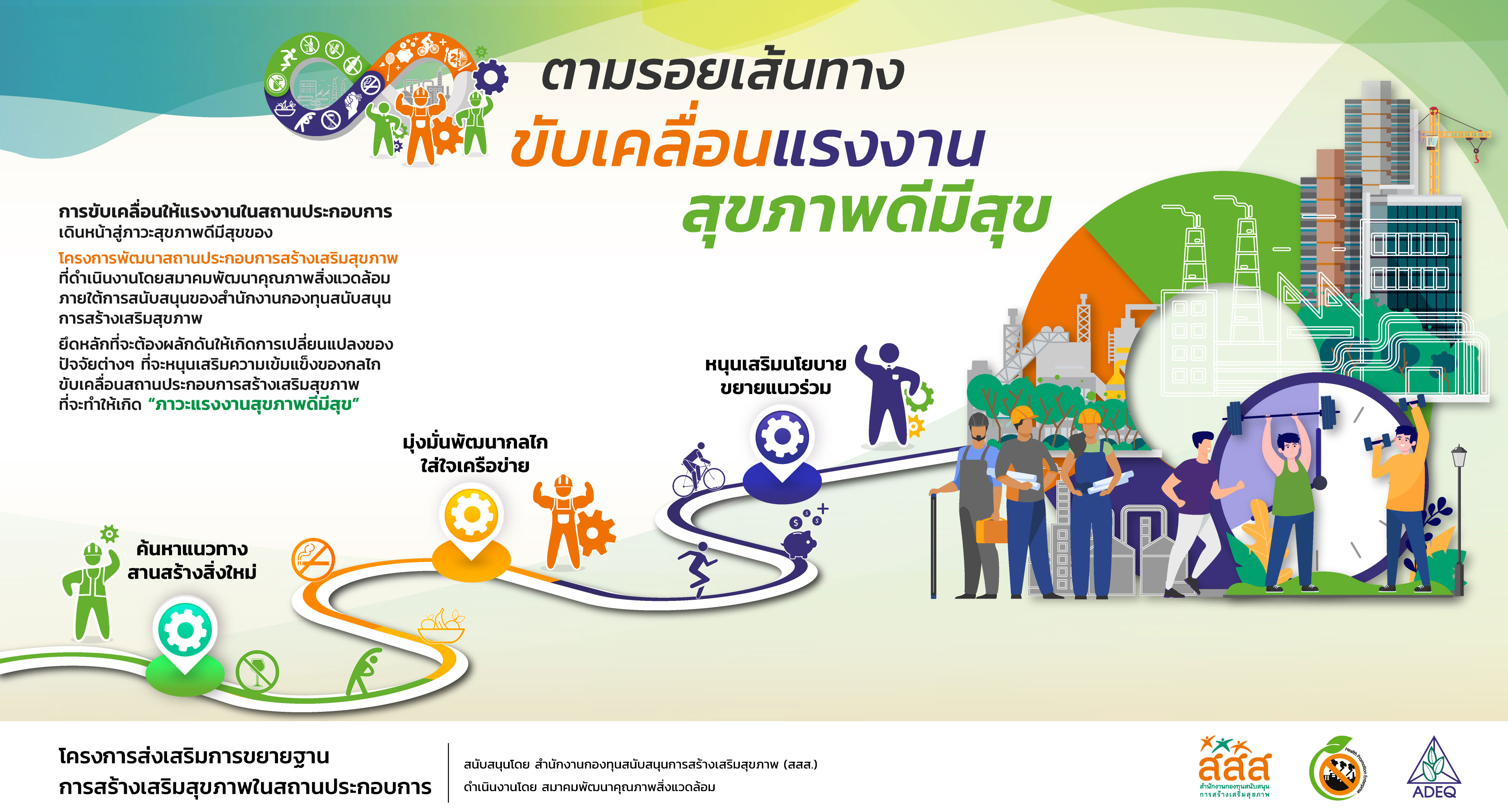 สมาคมพัฒนาคุณภาพสิ่งแวดล้อม ได้ดำเนินงานโครงการส่งเสริมการขยายฐานการสร้างเสริมสุขภาพในสถานประกอบการ ที่รับงบประมาณสนับสนุนจากสำนักงานกองทุนสนับสนุนการสร้างเสริมสุขภาพ (สสส.) เพื่อส่งเสริมและสนับสนุนให้เกิดเครือข่ายขับเคลื่อนสถานประกอบการสร้างเสริมสุขภาพในทั้งในรูปแบบจังหวัด และสถานประกอบการ ด้วยการสานพลังนำกลไกสนับสนุนต่างๆที่เกี่ยวข้องมาร่วมสร้างปัจจัยเอื้อในการขยายฐานการสร้างเสริมสุขภาพในสถานประกอบการ โดยออกแบบให้มีการดำเนินงานที่ประกอบด้วยการทำกิจกรรมต่างๆ ที่สนับสนุนซึ่งกันและกัน ประกอบด้วยกิจกรรมพัฒนาเครือข่ายขับเคลื่อนการสร้างเสริมสุขภาพในสถานประกอบการระดับพื้นที่ และ กิจกรรมส่งเสริมและสนับสนุนการสร้างเสริมสุขภาพในสถานประกอบการ ซึ่งจากการดำเนินงานที่ผ่านมาตั้งแต่ วันที่ 1 ตุลาคม 2561 จนถึงปัจจุบัน ทำให้เกิดการบูรณาการดำเนินงานสร้างเสริมสุขภาพในสถานประกอบการ ทั้งเชิงพื้นที่และกลไกต่างๆ ดังนั้นเพื่อเป็นการสร้างขวัญและกำลังใจให้กับหน่วยงาน องค์กร บุคคลที่ร่วมสนับสนุน ร่วมดำเนินงาน จนประสบความสำเร็จในการคุ้มครองสุขภาพของวัยแรงงานในสถานประกอบการ โครงการฯจึงได้จัดให้มีการประกาศเกียรติคุณเครือข่าย บุคลากรด้านสุขภาพและสถานประกอบการขึ้น ในงานมหกรรมสถานประกอบการสร้างเสริมสุขภาพ: สานพลัง เสริมแรง ขับเคลื่อนสถานประกอบการสร้างเสริมสุขภาพ เพื่อบ่งบอกถึงความสำคัญของการดำเนินงานสร้างเสริมสุขภาพของกลุ่มวัยทำงานในสถานประกอบการให้ประสบความสำเร็จ ยั่งยืน อย่างทั่วถึงต้องอาศัยการทำงานแบบมีส่วนร่วมทั้งภาครัฐ ภาคเอกชน วิชาการและสังคมที่เข้ามาร่วมคิด ร่วมทำ บนเป้าหมายร่วมเดียวกัน