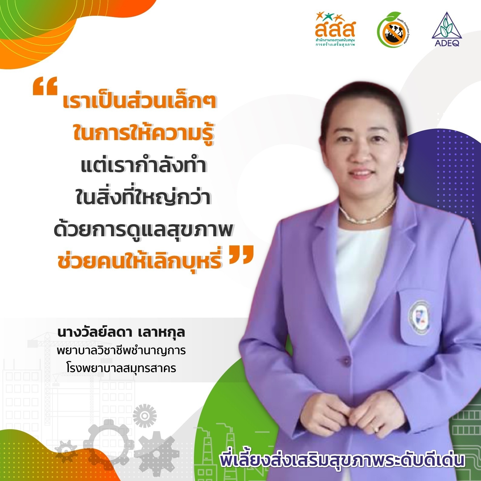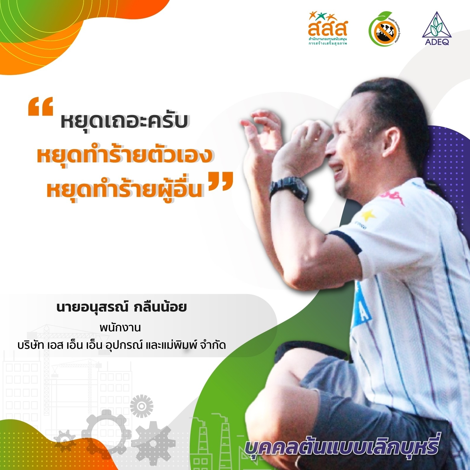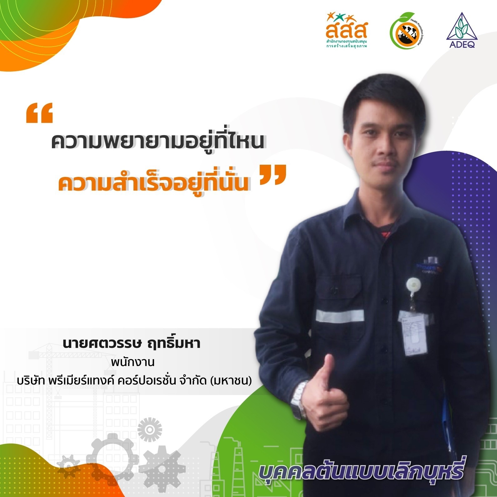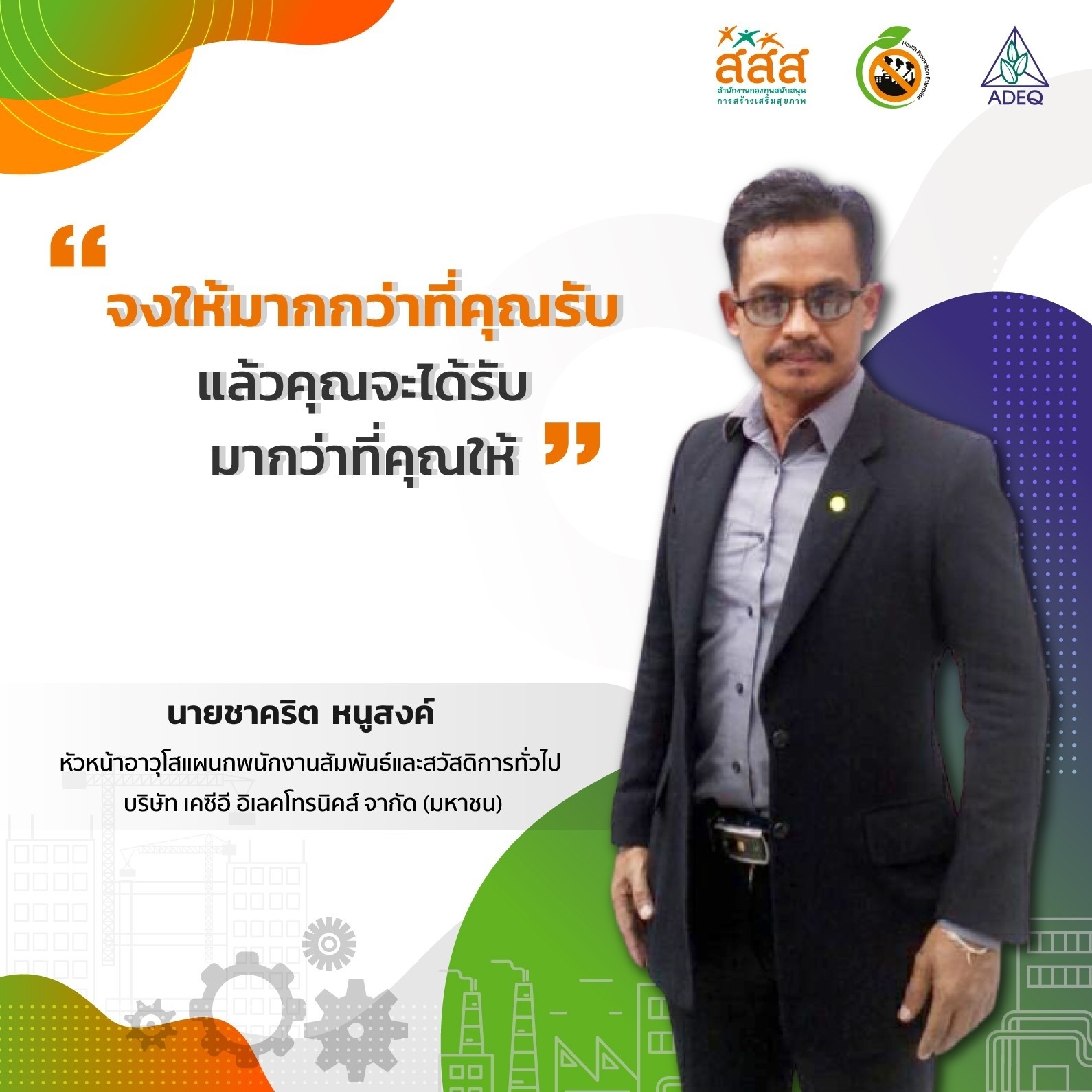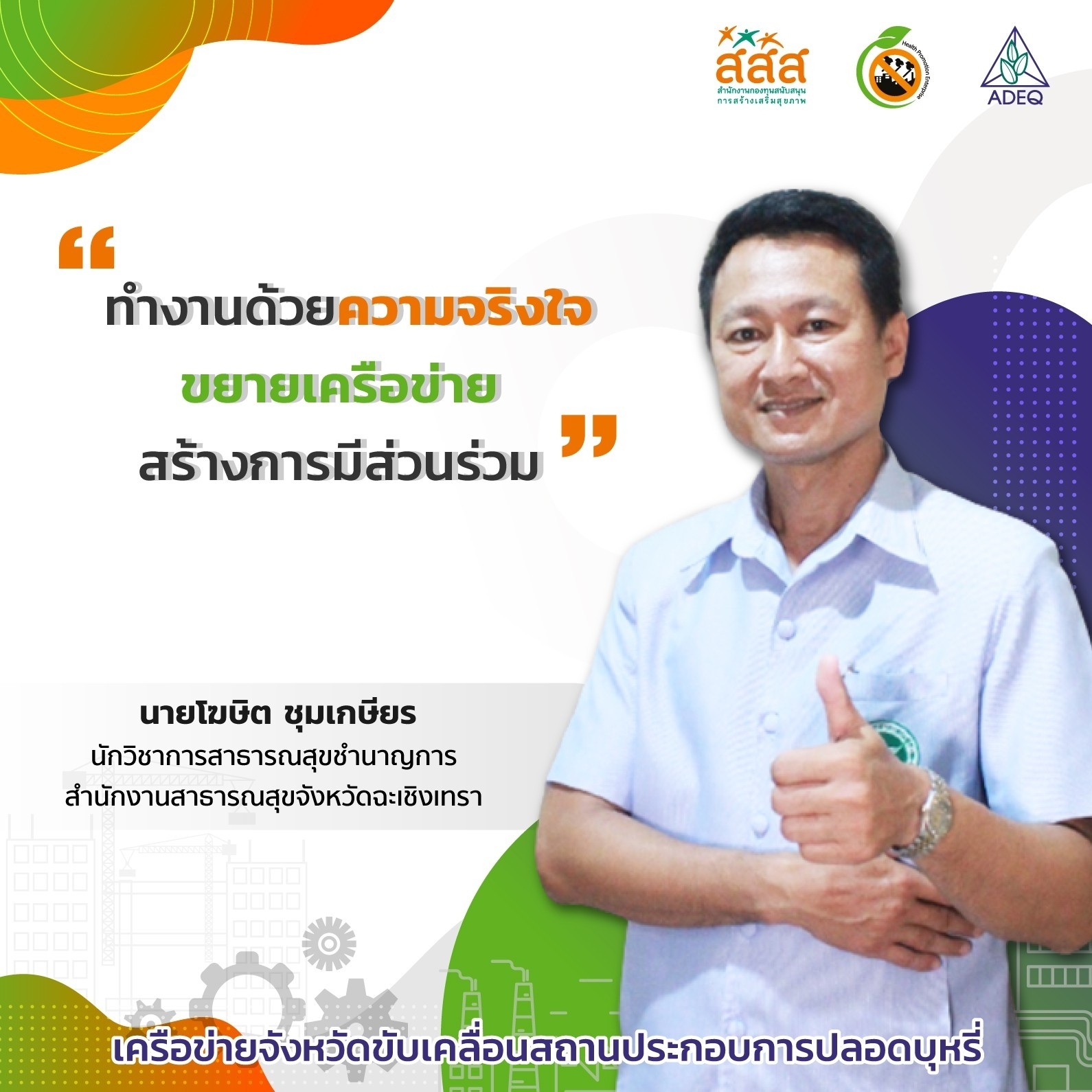 สมาคมพัฒนาคุณภาพสิ่งแวดล้อม ได้ดำเนินงานโครงการส่งเสริมการขยายฐานการสร้างเสริมสุขภาพในสถานประกอบการ ที่รับงบประมาณสนับสนุนจากสำนักงานกองทุนสนับสนุนการสร้างเสริมสุขภาพ (สสส.) เพื่อส่งเสริมและสนับสนุนให้เกิดเครือข่ายขับเคลื่อนสถานประกอบการสร้างเสริมสุขภาพในทั้งในรูปแบบจังหวัด และสถานประกอบการ ด้วยการสานพลังนำกลไกสนับสนุนต่างๆที่เกี่ยวข้องมาร่วมสร้างปัจจัยเอื้อในการขยายฐานการสร้างเสริมสุขภาพในสถานประกอบการ โดยออกแบบให้มีการดำเนินงานที่ประกอบด้วยการทำกิจกรรมต่างๆ ที่สนับสนุนซึ่งกันและกัน ประกอบด้วยกิจกรรมพัฒนาเครือข่ายขับเคลื่อนการสร้างเสริมสุขภาพในสถานประกอบการระดับพื้นที่ และ กิจกรรมส่งเสริมและสนับสนุนการสร้างเสริมสุขภาพในสถานประกอบการ ซึ่งจากการดำเนินงานที่ผ่านมาตั้งแต่ วันที่ 1 ตุลาคม 2561 จนถึงปัจจุบัน ทำให้เกิดการบูรณาการดำเนินงานสร้างเสริมสุขภาพในสถานประกอบการ ทั้งเชิงพื้นที่และกลไกต่างๆ ดังนั้นเพื่อเป็นการสร้างขวัญและกำลังใจให้กับหน่วยงาน องค์กร บุคคลที่ร่วมสนับสนุน ร่วมดำเนินงาน จนประสบความสำเร็จในการคุ้มครองสุขภาพของวัยแรงงานในสถานประกอบการ โครงการฯจึงได้จัดให้มีการประกาศเกียรติคุณเครือข่าย บุคลากรด้านสุขภาพและสถานประกอบการขึ้น ในงานมหกรรมสถานประกอบการสร้างเสริมสุขภาพ: สานพลัง เสริมแรง ขับเคลื่อนสถานประกอบการสร้างเสริมสุขภาพ เพื่อบ่งบอกถึงความสำคัญของการดำเนินงานสร้างเสริมสุขภาพของกลุ่มวัยทำงานในสถานประกอบการให้ประสบความสำเร็จ ยั่งยืน อย่างทั่วถึงต้องอาศัยการทำงานแบบมีส่วนร่วมทั้งภาครัฐ ภาคเอกชน วิชาการและสังคมที่เข้ามาร่วมคิด ร่วมทำ บนเป้าหมายร่วมเดียวกัน