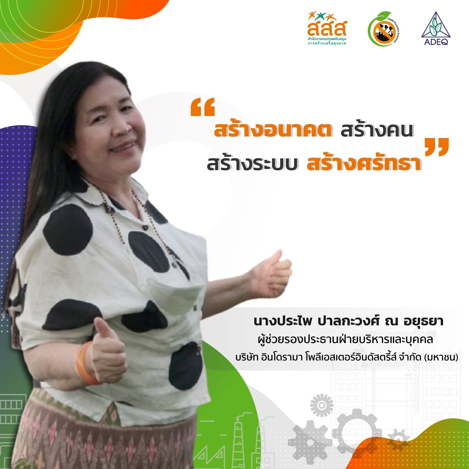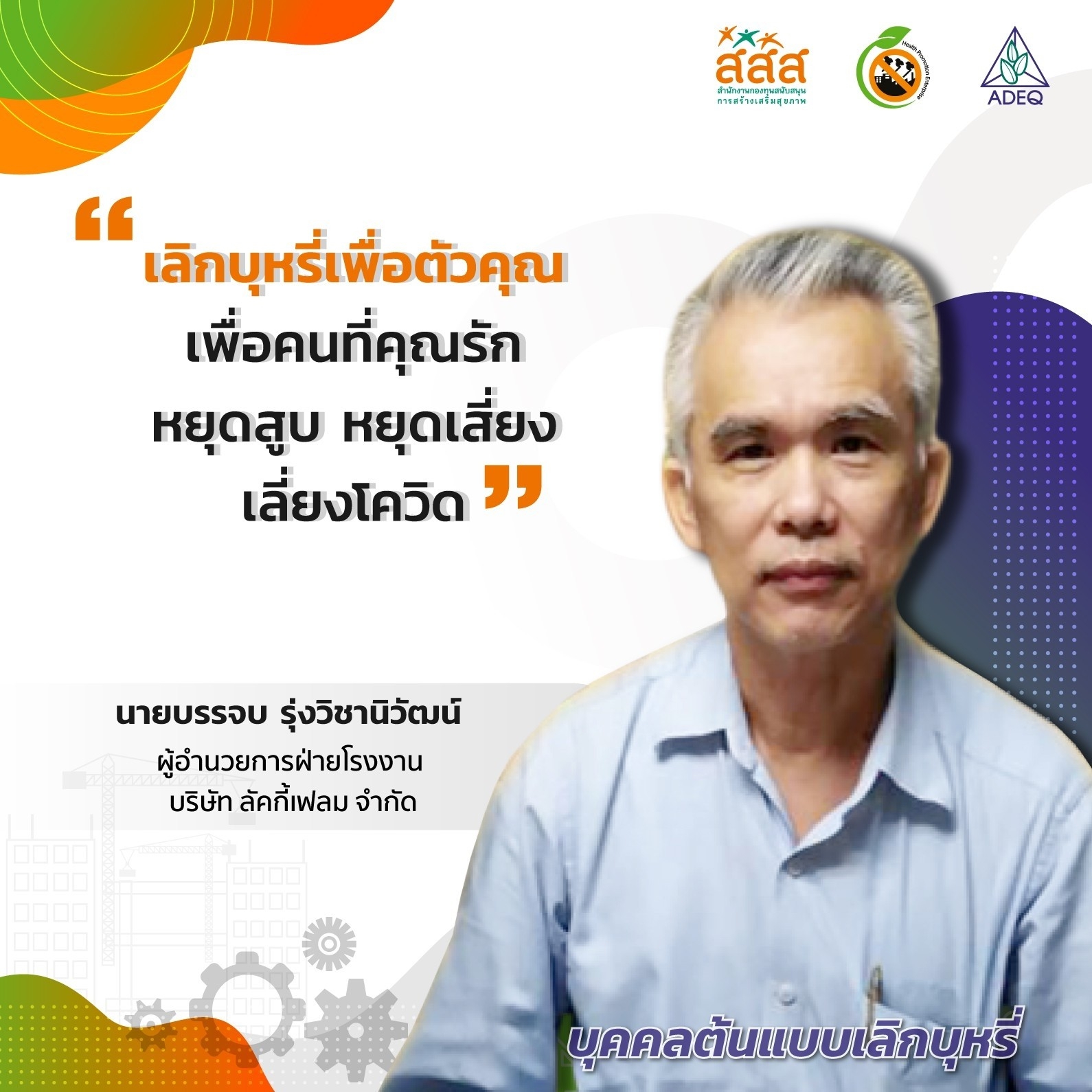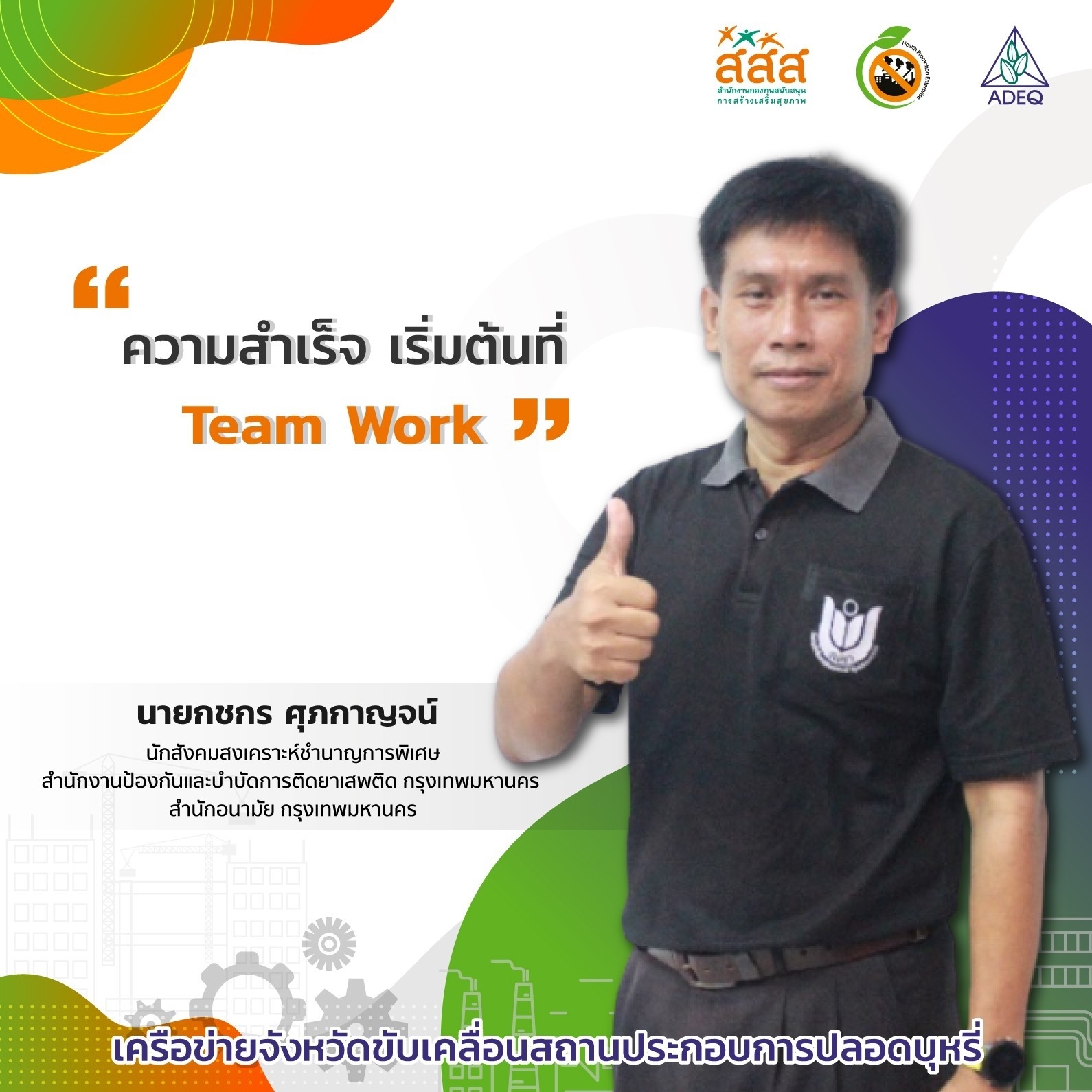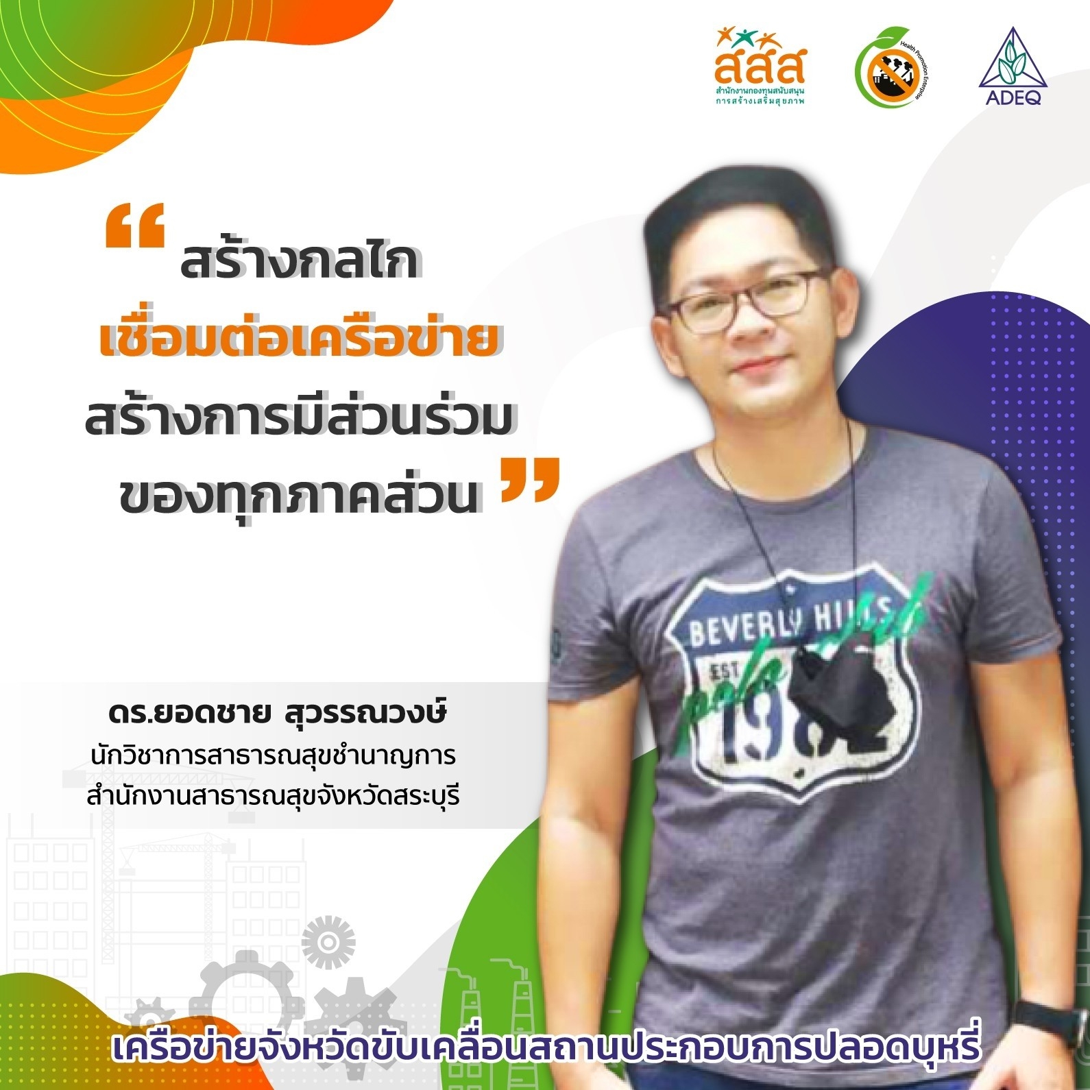 สมาคมพัฒนาคุณภาพสิ่งแวดล้อม ได้ดำเนินงานโครงการส่งเสริมการขยายฐานการสร้างเสริมสุขภาพในสถานประกอบการ ที่รับงบประมาณสนับสนุนจากสำนักงานกองทุนสนับสนุนการสร้างเสริมสุขภาพ (สสส.) เพื่อส่งเสริมและสนับสนุนให้เกิดเครือข่ายขับเคลื่อนสถานประกอบการสร้างเสริมสุขภาพในทั้งในรูปแบบจังหวัด และสถานประกอบการ ด้วยการสานพลังนำกลไกสนับสนุนต่างๆที่เกี่ยวข้องมาร่วมสร้างปัจจัยเอื้อในการขยายฐานการสร้างเสริมสุขภาพในสถานประกอบการ โดยออกแบบให้มีการดำเนินงานที่ประกอบด้วยการทำกิจกรรมต่างๆ ที่สนับสนุนซึ่งกันและกัน ประกอบด้วยกิจกรรมพัฒนาเครือข่ายขับเคลื่อนการสร้างเสริมสุขภาพในสถานประกอบการระดับพื้นที่ และ กิจกรรมส่งเสริมและสนับสนุนการสร้างเสริมสุขภาพในสถานประกอบการ ซึ่งจากการดำเนินงานที่ผ่านมาตั้งแต่ วันที่ 1 ตุลาคม 2561 จนถึงปัจจุบัน ทำให้เกิดการบูรณาการดำเนินงานสร้างเสริมสุขภาพในสถานประกอบการ ทั้งเชิงพื้นที่และกลไกต่างๆ ดังนั้นเพื่อเป็นการสร้างขวัญและกำลังใจให้กับหน่วยงาน องค์กร บุคคลที่ร่วมสนับสนุน ร่วมดำเนินงาน จนประสบความสำเร็จในการคุ้มครองสุขภาพของวัยแรงงานในสถานประกอบการ โครงการฯจึงได้จัดให้มีการประกาศเกียรติคุณเครือข่าย บุคลากรด้านสุขภาพและสถานประกอบการขึ้น ในงานมหกรรมสถานประกอบการสร้างเสริมสุขภาพ: สานพลัง เสริมแรง ขับเคลื่อนสถานประกอบการสร้างเสริมสุขภาพ เพื่อบ่งบอกถึงความสำคัญของการดำเนินงานสร้างเสริมสุขภาพของกลุ่มวัยทำงานในสถานประกอบการให้ประสบความสำเร็จ ยั่งยืน อย่างทั่วถึงต้องอาศัยการทำงานแบบมีส่วนร่วมทั้งภาครัฐ ภาคเอกชน วิชาการและสังคมที่เข้ามาร่วมคิด ร่วมทำ บนเป้าหมายร่วมเดียวกัน